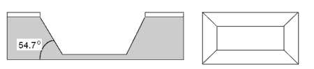 An anisotropic wet etch on a silicon wafer creates a cavity with a trapezoidal cross-section as shown in Fig. 3.8. The bottom of the cavity is a <100> plane, and the sides are <111> planes. The white material is an etch mask, and the grey material is silicon. The angle between (111) planes and (100) surface is 54.7° as calculated before and the etching stops at (111) planes at this angle resulting a V-groove.