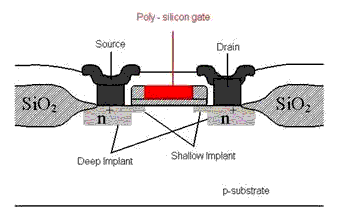 Fig. 3.65 : Cross section of NMOS transistor in a self aligned Poly Silicon Gate Technology