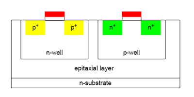 It is also possible to create both a p-well and an n-well for the n-MOSFET's and p-MOSFET respectively in the twin well or twin tub technology. Such a choice means that the process is independent of the dopant type of the starting substrate (provided it is only lightly doped).