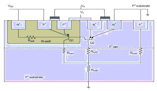 Fig. 3.69 : Cross section of a CMOS inverter with the possible parasitic bipolar transistors