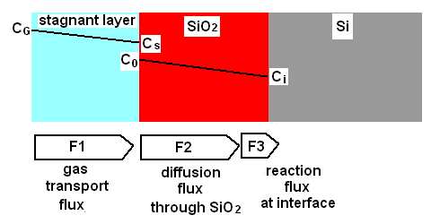 Fig. 3.15 : A Model for thermal oxidation of silicon indicating the concentration of species
