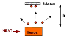 In the first stage, as shown in Fig. 3.22 the gaseous state is achieved by heating the source so that its vapor pressure (Pvapor) is greater than 10-4 torr. The evaporation is carried out in standard base vacuum pressures and the evaporation rate (flux) can be estimated from kinetic theory described in previous section. Some sources sublime from solid while others evaporate from liquid. When source compounds are changed to vapor, it may break apart and produce films with different stoichiometry. For example instead of SiO2, one may end up with SiOx, where x < 2. Similarly, metal alloy sources do not give same alloy in film; its components evaporate independently based on each separate vapor pressure and the composition of alloy source also changes with time.