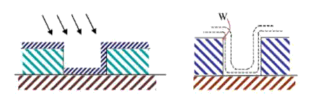 There are several sources of contamination in an evaporation scheme. Contamination occurs from source materials, source/substrate heaters and residual gas in chamber. One can have good film purity by using high purity source materials, using low diffusion materials as source/substrate heaters, with better vacuum and higher deposition rate materials . The e-beam process though expensive, is usually "better" than thermal evaporation because of less contamination from the source holder. Only the desired material is heated and sustains high quality vacuum environment. They are especially suitable for higher melting point materials (T~3000°C). Higher deposition rates and better control of deposition rates also makes e-beam an attractive choice. As shown in Fig. 3.27, the step coverage is poor in evaporation methods because of shadow effects. By contrast, the CVD and sputtering offer better step coverage.