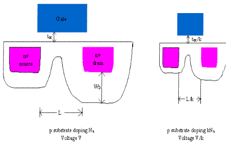 Fig 4.1: Cross section of (a) original NMOS transistor and (b) scaled NMOS transistor