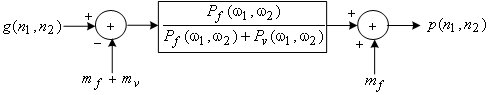 If we impose the additional constraint that and are samples of Gaussian random processes then the Wiener filter in (6.2.20) is the optimal minimum mean square error estimator of the signal among both linear and nonlinear estimators. The Wiener filter was first considered for image restoration in the early 1960s. It has influenced the development of many other image restoration systems. The Wiener filter in (6.2.20) was derived under the assumption that and are samples of zero-mean processes. If has a mean of and has a mean of , then and are first subtracted from the degraded . The resulting signal is next filtered by the Wiener filter. The signal mean is then added to the filtered signal. This is shown in Figure 6.3.