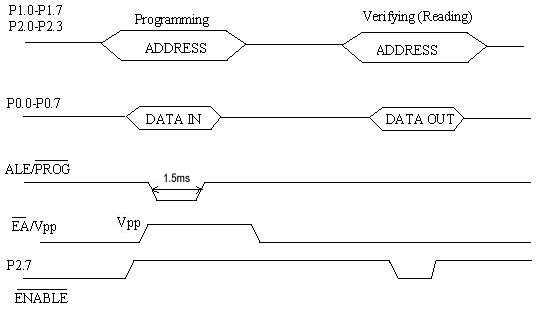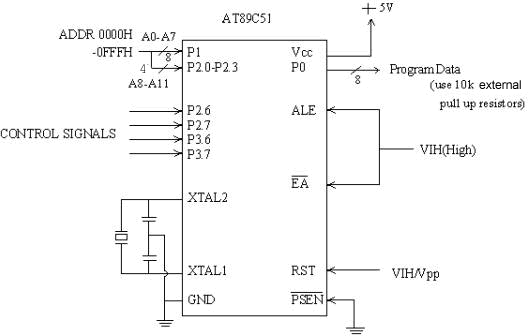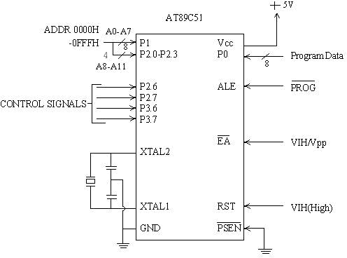Programming of microcontrollers means writing to the internal program memory. Most of the modern microcontrollers are equipped with central program memory (Flash EEPROM) that can be programmed and erased electrically. Atmel AT89C51 is one such IC. AT89C51 is available in a 40 pin DIP so that it can be easily hooked up in a breadboard or a PCB by a beginner. AT89C51 has 4k byte of Flash program memory. The AT89C51 program memory is programmed byte-by-byte. To program any non-blank on-chip memory, the entire program memory has to be erased before programming.