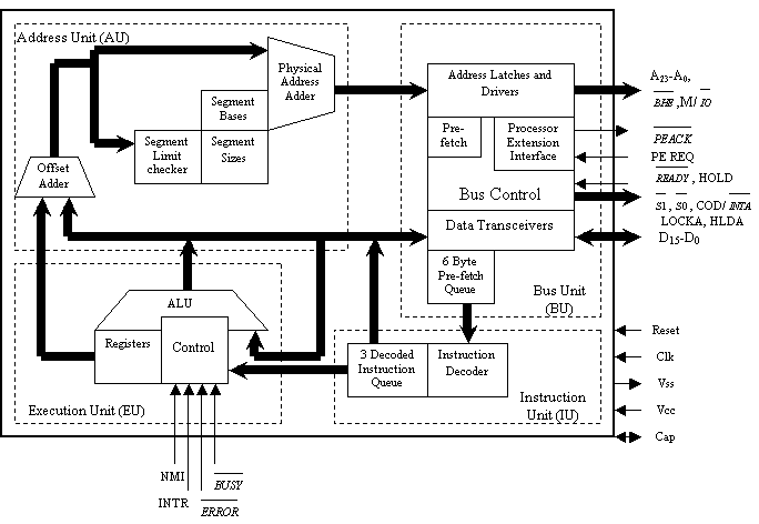 | Memory is organized into logical segments. Segment size can be anywhere between 1 Byte to 16 KByte. All 24 address pins are active and 16 MByte of physical memory is available. |