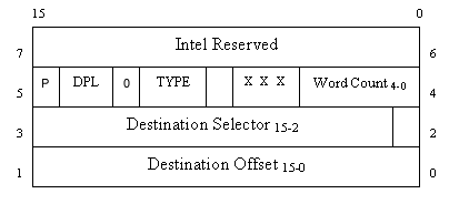 Tasks operate at the lowest privilege level. Usually, segments at a lower privilege level are not allowed to access segments at a higher privilege level directly. However, a lower level segment can access a higher level segment indirectly by a Gate Descriptor. The details of a gate descriptor are given herewith. |