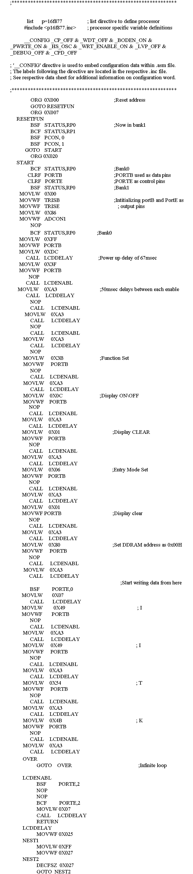 LCD was successfully interfaced with PIC16F877 microcontroller and displayed "IITK" in the LCD. |