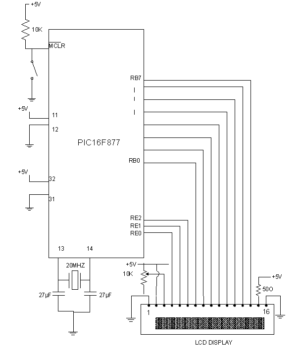 To interface LCD (Displaytech 162A) with PIC16F877microcontroller and to display "IITK" in the Liquid Crystal Display (LCD). |