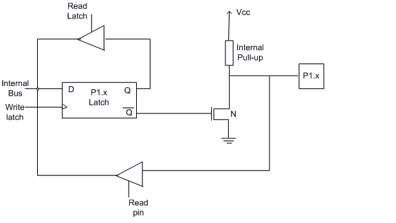 Port-1 does not have any alternate function i.e. it is dedicated solely for I/O interfacing. When used as output port, the pin is pulled up or down through internal pull-up. To use port-1 as input port, '1' has to be written to the latch. In this input mode when '1' is written to the pin by the external device then it read fine. But when '0' is written to the pin by the external device then the external source must sink current due to internal pull-up. If the external device is not able to sink the current the pin voltage may rise, leading to a possible wrong reading. |