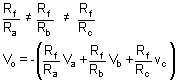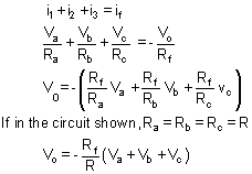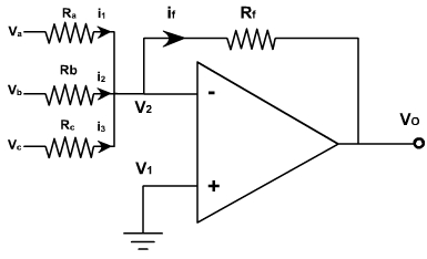 The configuration is shown in fig. 2. With three input voltages va, vb & vc. Depending upon the value of Rf and the input resistors Ra, Rb, Rc the circuit can be used as a summing amplifier, scaling amplifier, or averaging amplifier.