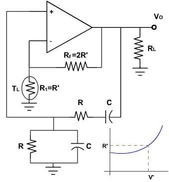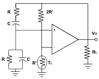 At power up, the tungsten lamp has a low resistance, and therefore, negative feedback is less. For this, reason, the loop gain AB is greater than 1, and oscillations can build up at the resonant frequency fr. As the oscillations build up, the tungsten lamp heats up slightly and its resistance increases. At the desired output level the tungsten lamp has a resistance R'. At this point