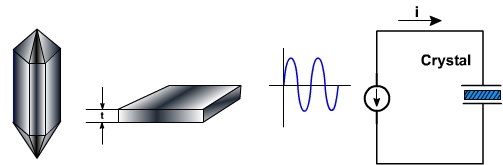 For use in electronic circuits, the slab is mounted between two metal plates, as shown in fig. 1. In this circuit the amount of crystal vibration depends upon the frequency of applied voltage. By changing the frequency, one can find resonant frequencies at which the crystal vibrations reach a maximum. Since the energy for the vibrations must be supplied by the ac source, the ac current is maximized at each resonant frequency. Most of the time, the crystal is cut and mounted to vibrate best at one of its resonant frequencies, usually the fundamental or lowest frequency. Higher resonant frequencies, called overtones, are almost exact multiplies of the fundamental frequency e.g. a crystal with a fundamental frequency of 1 MHz has a overtones of 2 MHz, 3 MHz and so on. The formula for the fundamental frequency of a crystal is