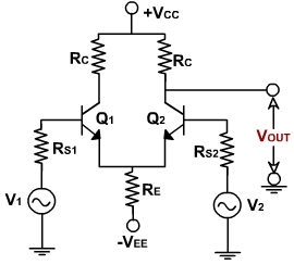 In this case, two input signals are given however the output is measured at only one of the two-collector w.r.t. ground as shown in fig. 2. The output is referred to as an unbalanced output because the collector at which the output voltage is measured is at some finite dc potential with respect to ground..