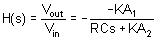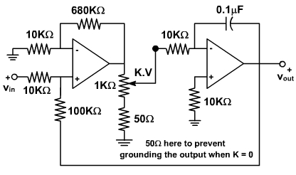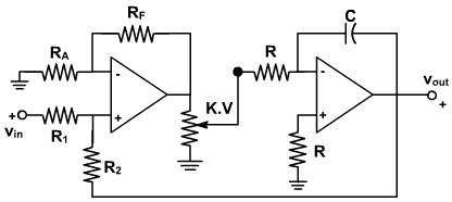 The corner frequency is at KA2 / RC. Thus, the frequency is adjustable and is proportional to K. Without use of the opamp, we would normally have a corner frequency which is inversely propostional to the resistor value. With a frequency proportional to K, we can use a linear taper potentiometer. The frequency is then linearly proportional to the setting of the potentiometer.