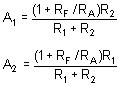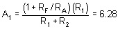 The ratio of R2 to R1 is the dc gain, so with a given value of R1 = 10KΩ, R2 must be 100 kΩ. We solve for A1 and A2 in the order to find the ratio, RF / RA.