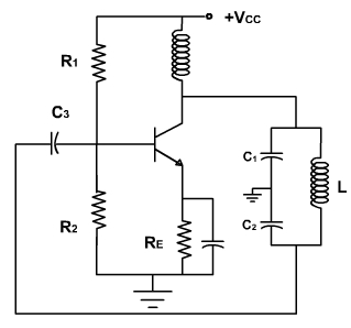 The alternative is an LC oscillator, a circuit that can be used for frequencies between 1MHz and 500MHz. The frequency range is beyond the frequency limit of most OPAMPs. With an amplifier and LC tank circuit, we can feedback a signal with the right amplitude and phase is feedback to sustain oscillations. Fig. 3, shows the circuit of colpitts oscillator.