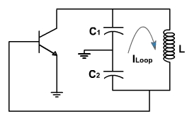 Fig. 4, shows a simplified ac equivalent circuit. The circulating or loop current in the tank flows through C1 in series with C2. The voltage output equals the voltage across C1. The feedback voltage vf appears across C2. This feedback voltage drives the base and sustains the oscillations developed across the tank circuit provided there is enough voltage gain at the oscillation frequency. Since the emitter is at ac ground the circuit is a CE connection.