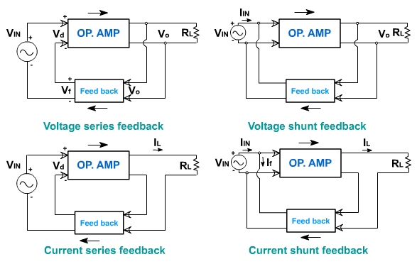 A closed loop amplifier can be represented by two blocks one for an OPAMP and other for a feedback circuits. There are four following ways to connect these blocks. These connections are shown in fig. 4.