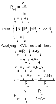 This shows that the output resistance of the voltage series feedback amplifier is ( 1 / 1+AB ) times the output resistance Ro of the op-amp. It is very small because (1+AB) is very large. It approaches to zero for an ideal voltage amplifier.