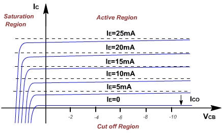 The collector current IC is completely determined by the input current IE and the VCB voltage. The relationship is given in fig. 2. It is a plot of IC versus VCB, with emitter current IE as parameter. The curves are known as the output or collector or static characteristics. The transistor consists of two diodes placed in series back to back (with two cathodes connected together). The complete characteristic can be divided in three regions.