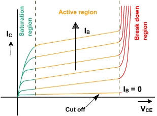 In this region both the diodes are forward biased by at least cut in voltage. Since the voltage VBE and VBC across a forward is approximately 0.7 V therefore, VCE = VCB + VBE = - VBC + VBE is also few tenths of volts. Hence saturation region is very close to zero voltage axis, where all the current rapidly reduces to zero. In this region the transistor collector current is approximately given by VCC / R C and independent of base current. Normal transistor action is last and it acts like a small ohmic resistance.