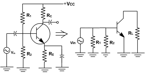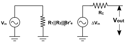 To find the voltage gain, consider an unloaded CE amplifier. The ac equivalent circuit is shown in fig. 3. The transistor can be replaced by its collector equivalent model i.e. a current source and emitter diode which offers ac resistance r'e.
