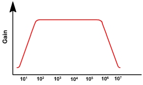 Fig. 2, shows frequency response curve of a RC coupled amplifier. The curve is usually plotted on a semilog graph paper with frequency range on logarithmic scale so that large frequency range can be accommodated. The gain is constant for a limited band of frequencies. This range is called mid-frequency band and gain is called mid band gain. AVM. On both sides of the mid frequency range, the gain decreases. For very low and very high frequencies the gain is almost zero.