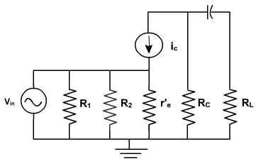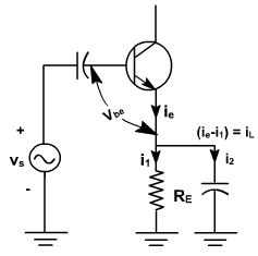 The other component due to which gain decreases at low frequencies is the bypass capacitor. The function of this capacitor is to bypass ac and blocks dc The impedence of this capacitor in mid frequency band is very low as compared to RE so it behaves like ac short but as the frequency decrease the XCE becomes more and no longer behaves like ac short. Now the emitter is not ac grounded. The ac emitter current i.e. divides into two parts i1 and i2, as shown in fig. 4. A current i1 passes through RE and rest of the current passes through C. Due to ac current i1 in RE, an ac voltage is developed i1 * RE. With the polarity marked at an instant. Thus the effective VL voltage is given by
