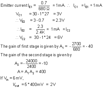 Fig. 8, shows a two stage direct coupled amplifier, no coupling or bypass capacitors are used. With a quiescent input voltage 1.4 V, emitter voltage = 1.4 - 0.7 = 0.7 V