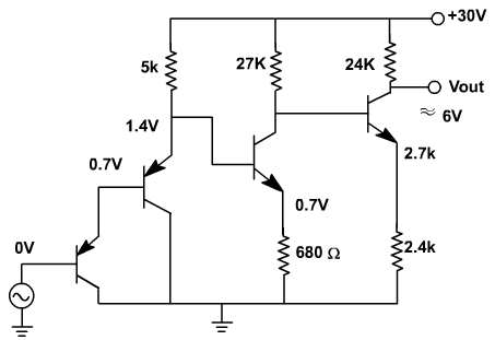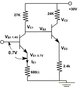 The quiescent V CE of the first transistor is only 0.7V and the quiescent of the second transistor is only 1.4V. Both the transistors are operating in active region because VCE(sat) is only 0.1 volt. The input is only in mV, which means that these transistors continue to operate in the active region when a small signal is present.