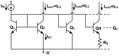 The errors in base current, however, do accumulate when multiple outputs are used and the current gain tends to deviate from unity. In these types of circuits, lateral transistors can be used since it is not important that b be large. Lateral transistors usually have a β of approximately 20 which is more than adequate for current sources.