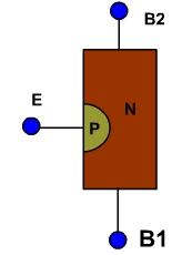 The symbol for UJT is shown in fig. 1. The UJT is having three terminals base1 (B1), base2 (B2) and emitter (E). The UJT is made up of an N-type silicon bar which acts as the base as shown in fig. 2. It is very lightly doped. A P-type impurity is introduced into the base, producing a single PN junction called emitter. The PN junction exhibits the properties of a conventional diode.
