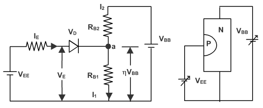 The ratio h is a property of UJT and it is always less than one and usually between 0.4 and 0.85. As long as IB = 0, the circuit of behaves as a voltage divider.