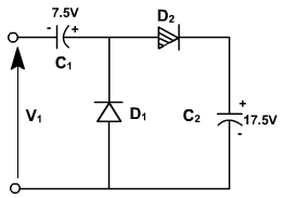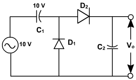 At the peak of the negative half cycle D1 is forward based, and D2 is reverse based. This charges C1 to the peak voltage Vp with the polarity shown. At the peak of the positive half cycle D1 is reverse biased and D2 is forward biased. Because the source and C1 are in series, C2 will change toward 2Vp. e.g. Capacitor voltage increases continuously and finally becomes 20V. The voltage waveform is shown in fig. 6.