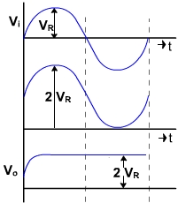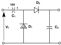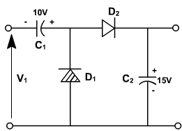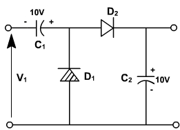 During t1 to t2, D2 becomes forward biased and conducts and at t2, when Vi is 10V total voltage change is 20V. If C1 = C2 = C, both the capacitor voltages charge to +10 V i.e. C1 voltage becomes 0 and C2 charges to +10V.