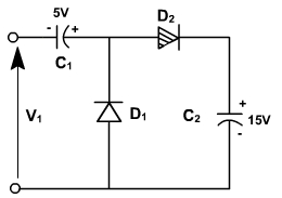 During t5 to t6 D2 is forward biased and conducts. The capacitor C2 voltage becomes +15 V and C1 voltage becomes +5 V.