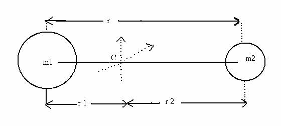 Fig.13.1. A rigid diatomic with masses m1 and m2 joined by a thin rod of length r = r1 + r2 .The centre of mass is at C. |