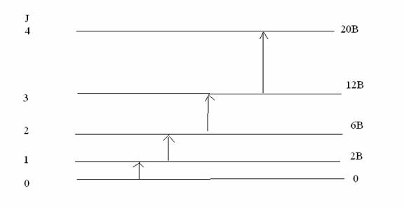 Fig. 13.2 Rotational energy levels of a rigid diatomic molecule and the allowed transitions. |