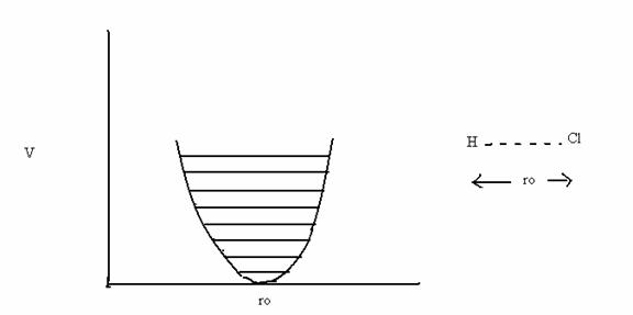 Figure 13.4. The potential energy of a harmonic oscillator V = k(r-ro)2. The force constants k in N/m for a few moleculues are, CO (1902), HF (966), HCl (516), HI (314). |