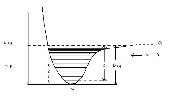 Fig. 13. 5. The Morse potential and the energy levels therein. Note the difference between the dissociation energy Do and the depth Deq. All molecules have a minimum of the zero point energy of hν/2 corresponding to the ν = 0 state. This is a consequence of the uncertainty principle! |