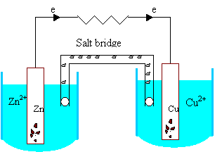 The left compartment consists of a zinc rod dipped in a solution containing Zn2+ ions (such as zinc sulphate) and the right compartment consists of a copper rod dipped in a solution containing Cu2+ ions (e.g., CuSO4 solution). The external circuit is completed by a wire of known resistance (for producing heat, light or other forms of work). The contact between the solutions is provided by a salt bridge containing saturated KCl or NH4NO3 solution along with gelatin or agar for confining the electrolyte in the tube. The salt bridge prevents mixing of the electrolytes, allows the flow of ions and reduces polarization near the electrodes. Electrons flow from the Zn electrode to the Cu electrode in the external circuit, or the positive charge flows from the Cu electrode to the Zn electrode. If this cell were to operate as a battery, the Cu electrode would be the positive terminal of the battery.