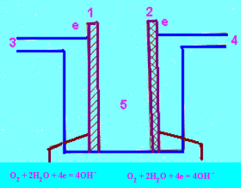 1. Porous Ni anode, 2] Porous Ni - NiO cathode, 3] H2 inlet, 4] O2 inlet, 5] Electrolyte, KOH (aq) |