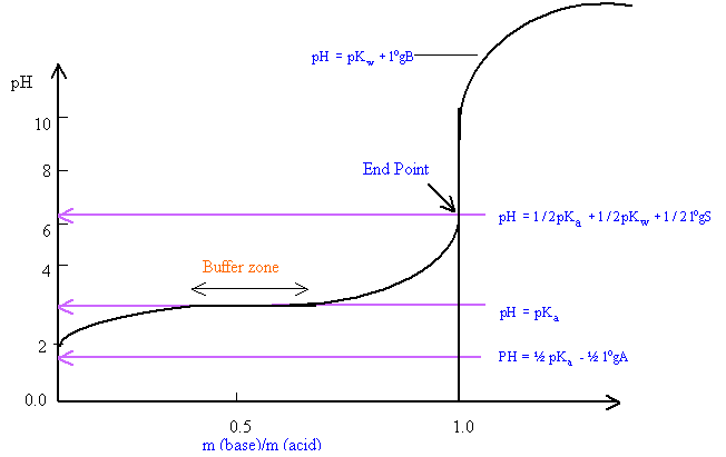 This equation reduces to simpler forms when a) no base is added, b) near the end point of the titration and c) when excess base is added beyond the end point.