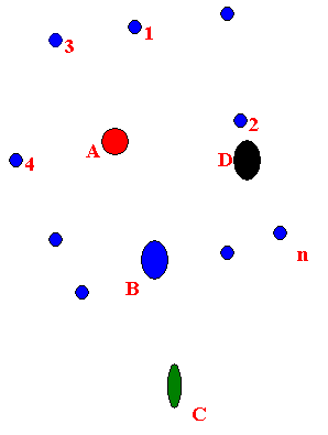 Schrödinger equation for a molecule looks like. In the following figure, A, B, C and D are the nuclei and 1,2,3 ….n are electrons. |
