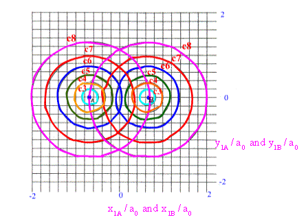 In fig 7.3 (a) the contour diagram of the atomic orbitals centered on the atoms A and B is shown in the xy plane. There are two atoms A and B and for each orbital on atoms A and B, there are two coordinates in the plane, ie, x1A and y1A for the orbital on atom A and x1B and y1B for the orbital on atom B. We consider the s orbitals, ie e -r1A/a 0 and e –r1B/a0 . The distance from the centers A and B are r1A and r1B . The z coordinate is not considered since we are plotting the values of the function in the xy plane.