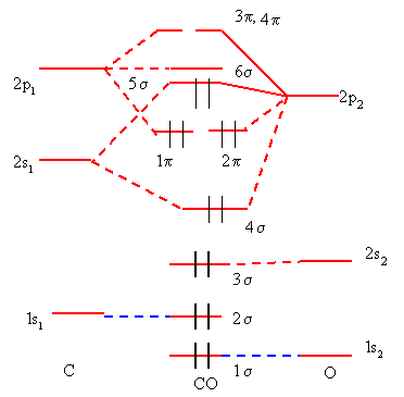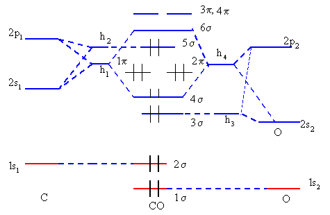 In CO there are a total of 14 electrons, 6 from C and 8 from O. The oxygen orbitals are lower in energy due to its larger nuclear charge. We may construct the MOs in two ways, a) without taking into account the hybridization of the AOs of each atom and b) considering the hybridization of the AOs in each atom. The energy level diagram for both the cases are shown in fig 8.5
