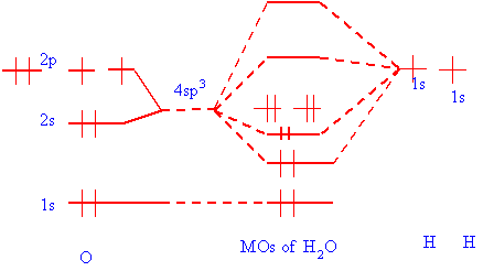 The "old" concept that rare gases do not form molecule due to their "closed" shell is gone! All (and the only thing!) that is needed to form a stable species is that in the MOs formed, there should be more number of electrons in bonding orbitals. Even if the numbers are equal, some stability can arise if the lowering in energy due to bonding MOs is more than the rise in energy due to the occupied antibonding MOs. Fig 9.3(c) shows the bonding in H2O. Formation of four hybrid orbitals in O (from the 2s and the three 2p orbitals) is shown in the figure. There are two pairs of bonding electrons and two pairs of "non bonding" electrons on the oxygen. These are the lone pairs. These principles illustrated in simple triatomics work in other larger molecules. We shall next turn to the details of hybridization.