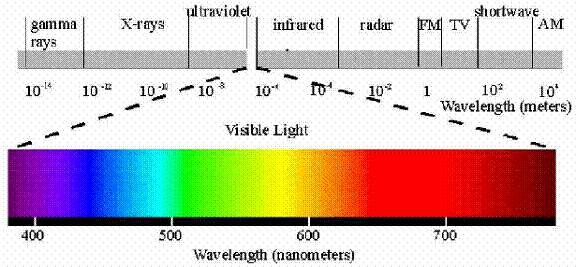 Depending on their wavelength range, electromagnetic waves are given different names. The figure shows the electromagnetic spectrum. What is known as visible light is the narrow band of wavelength from 400 nm (blue) to 700 nm (red). To its either side are the infrared from 700 nm to 0.3 mm and the ultraviolet from 30 nm to 400 nm. Microwaves have longer wavelength than the infrared (0.3 mm to 300 mm) and the radio waves have wavelengths longer than 300 mm. The television broadcast takes place in a small range at the end of the microwave spectrum. Those with wavelengths shorter than ultraviolet are generally called rays . Prominent among them are x-rays with wavelengths 0.03 nm t0 30 nm and -rays with wavelengths shorter than 0.03 nm. |